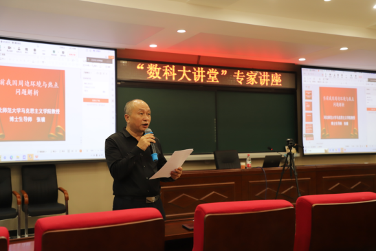 “党建大讲堂”专家讲座首讲,邀请到马克思主义学院张骥教授做题为《当前中国周边环境与热点问题解析》的辅导报告。张骥教授从“当前国际形势的总体特点”“中国周边环境面临的新形势”“对国际国内政治环境几个热点问题的分析”三个方面展开,聚焦党的二十大对中国国际形势的新判断、如何科学认识百年未有之大变局、西方主要国家对华政策变化的根本原因等多个前沿问题,对我国面临的国际形势和国内大势进行了深入的分析解读。