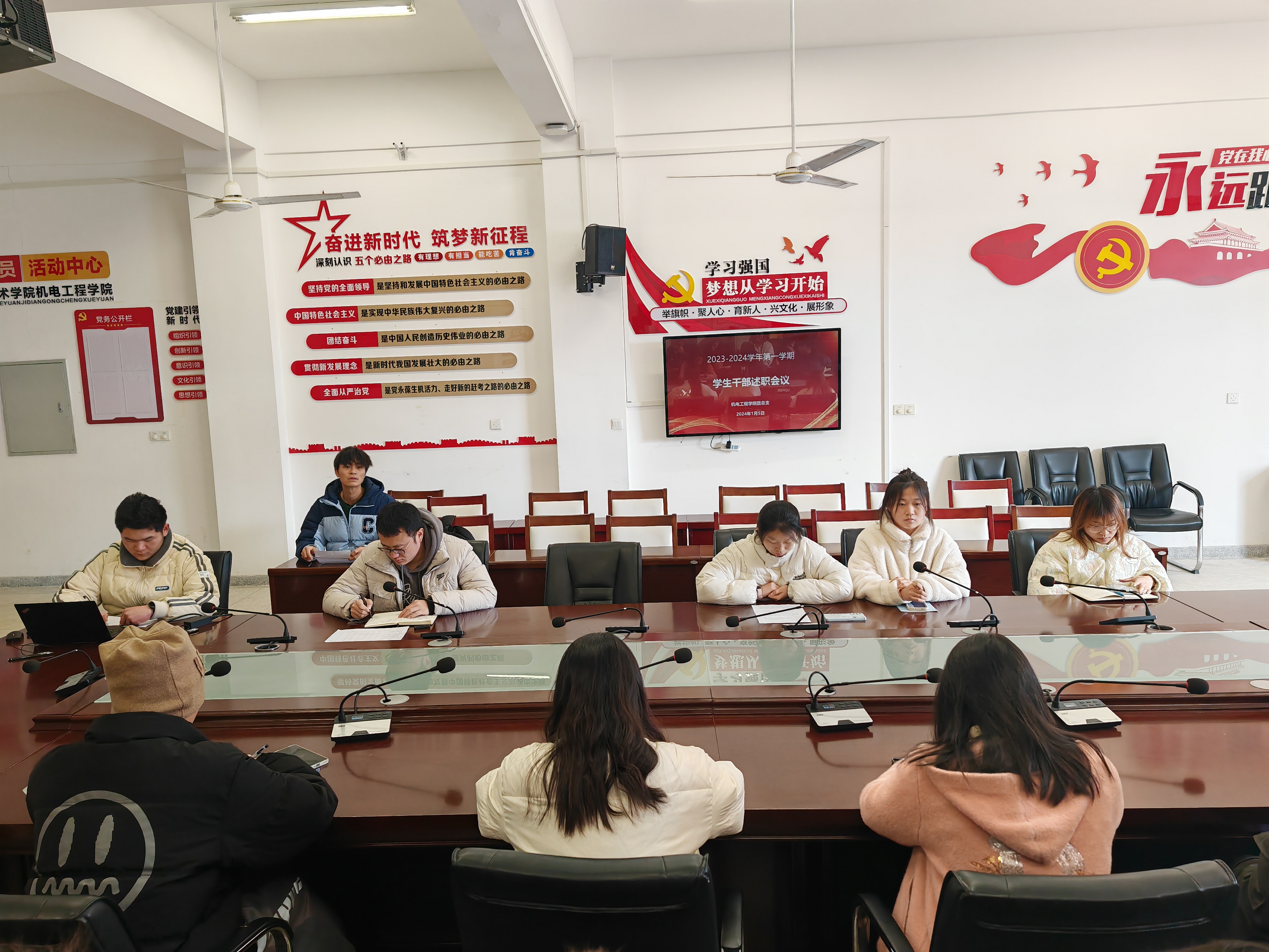 为加强学生干部的使命感和责任感,总结反思团总支学生会工作,统筹未来工作安排,提升团总支学生会自我管理、自我服务、自我教育水平,1月5日下午,WilliamHill中文官方网站在机电楼二楼会议室举行2023-2024学年第一学期学生干部工作述职汇报会,学院团总支书记张开、学生会各部门负责同学等参加会议。