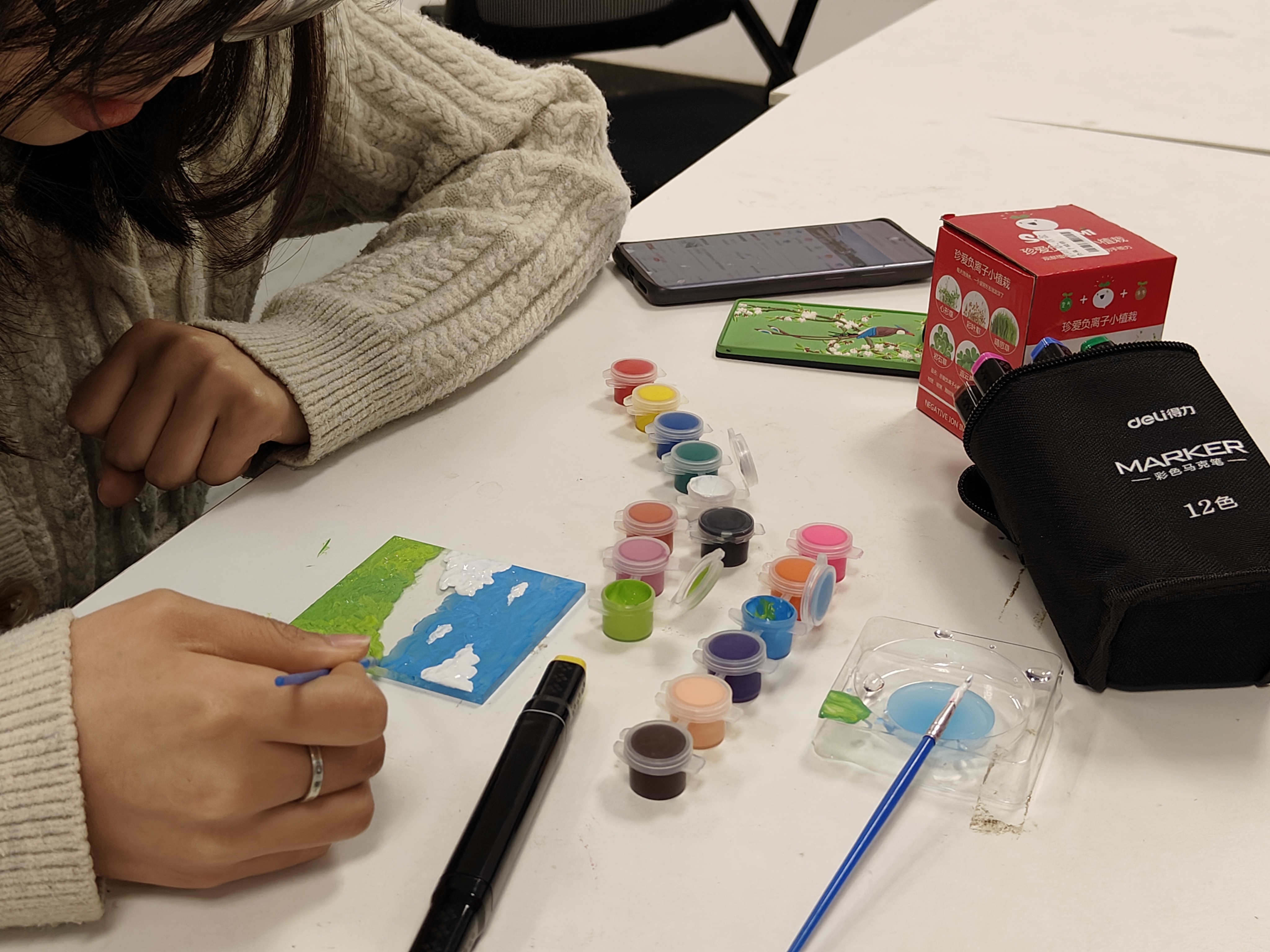 “画出你心中的绿色”绘图活动。活动中,参与者用事先准备好的亚克力板和绘画工具,按照时间要求将自己理想中的“绿色”在画板上展现出来。同学们用丰富的想象力和创造力,通过绘画表达了对绿色环境的向往和珍惜。五彩斑斓的画作展示了他们对自然的热爱与对环境保护的责任感。