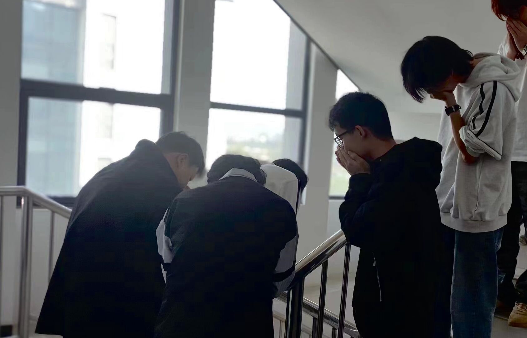 演练现场,随着尖锐的火警警报声响起,教室内的学生们迅速从平时的安静学习状态切换到紧急逃生模式。在教师和学院安全员的指导下,学生们迅速低头弯腰,按照预设的安全路线快速向教学楼底的指定安全区域集结。尽管天公不作美,但学生们的行动丝毫不受影响,反而更显冷静与果断。