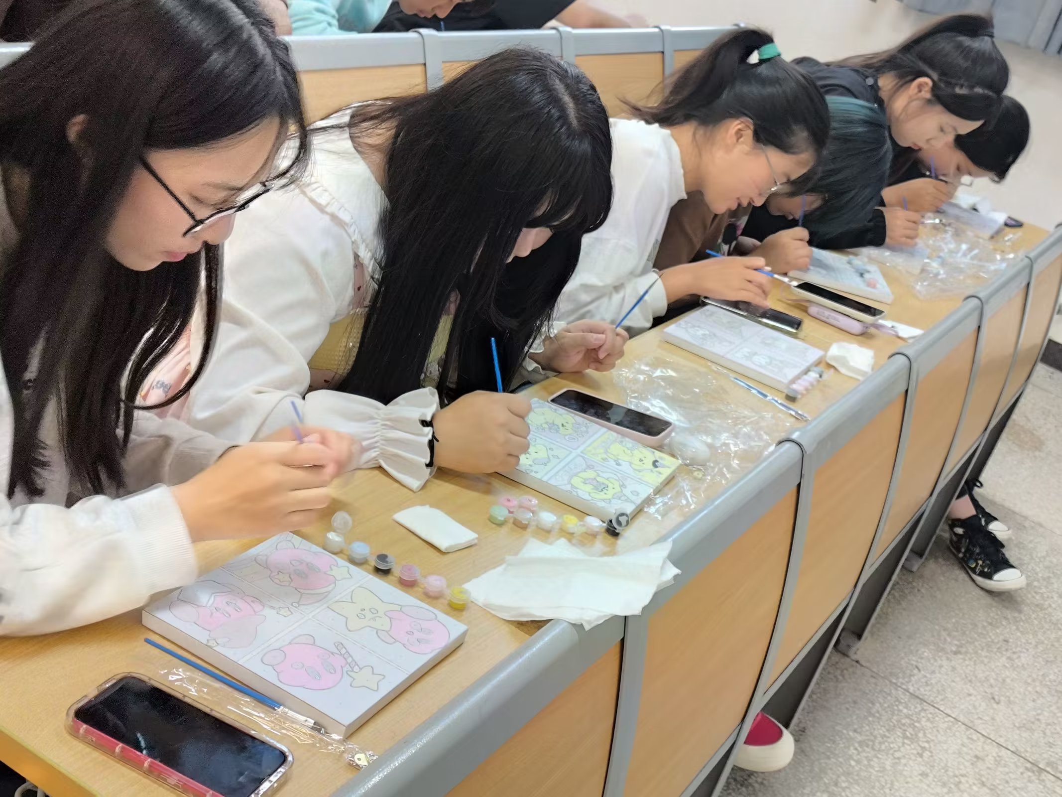 活动现场轻松愉悦,大家在部门精心准备好的油画中选择自己喜欢的图案,迫不及待地打开颜料盒,用手中的画笔认真地勾画涂色,部分油画相对复杂,同学们互相合作,你一笔,我一笔,色彩在数字间舞动,勾勒出五彩缤纷的油画世界。其实油画就如同生活一般,有残缺未被填满的色块,有被覆盖掉的色块,有稍不注意就画超出去的色块;也正是过程中出现各种小差错,才造就出与众不同的多彩世界。