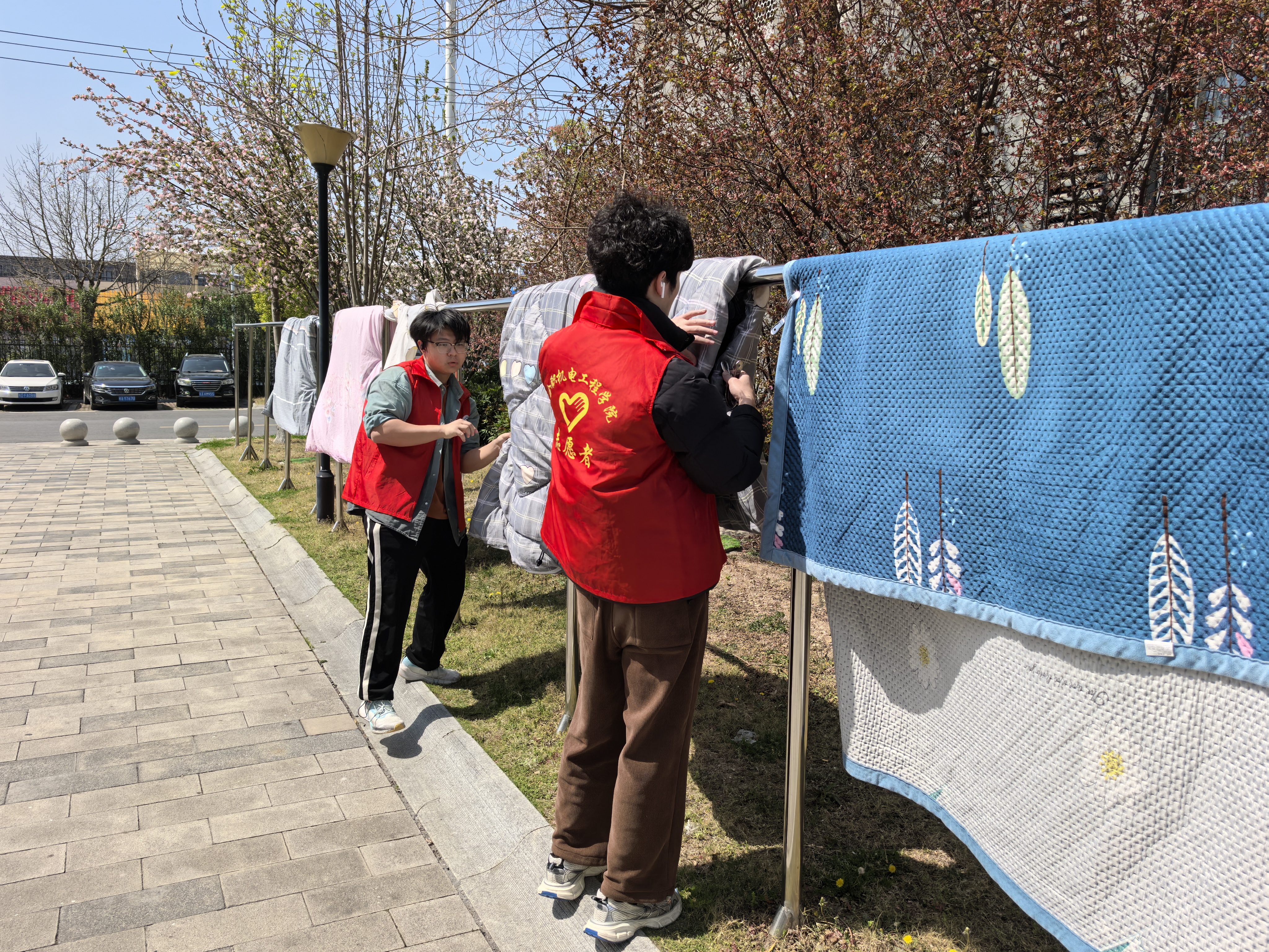 车辆整理组的志愿者重点对食堂周边乱停放的电动车、自行车进行规范整理。他们将车辆逐一调整至指定区域,对齐车头方向,清理占道车辆。经过两小时的细致工作,原本杂乱的停车区变得整齐划一,校园道路也更加通畅。生活帮扶组的志愿者们则关注同学们的日常生活需求。针对宿舍区晾晒被褥频繁被风吹落的问题,他们逐栋巡查,拾取被风吹至地面或树枝上的被子,用消毒湿巾擦拭表面灰尘后,重新用加固夹固定于晾衣架。