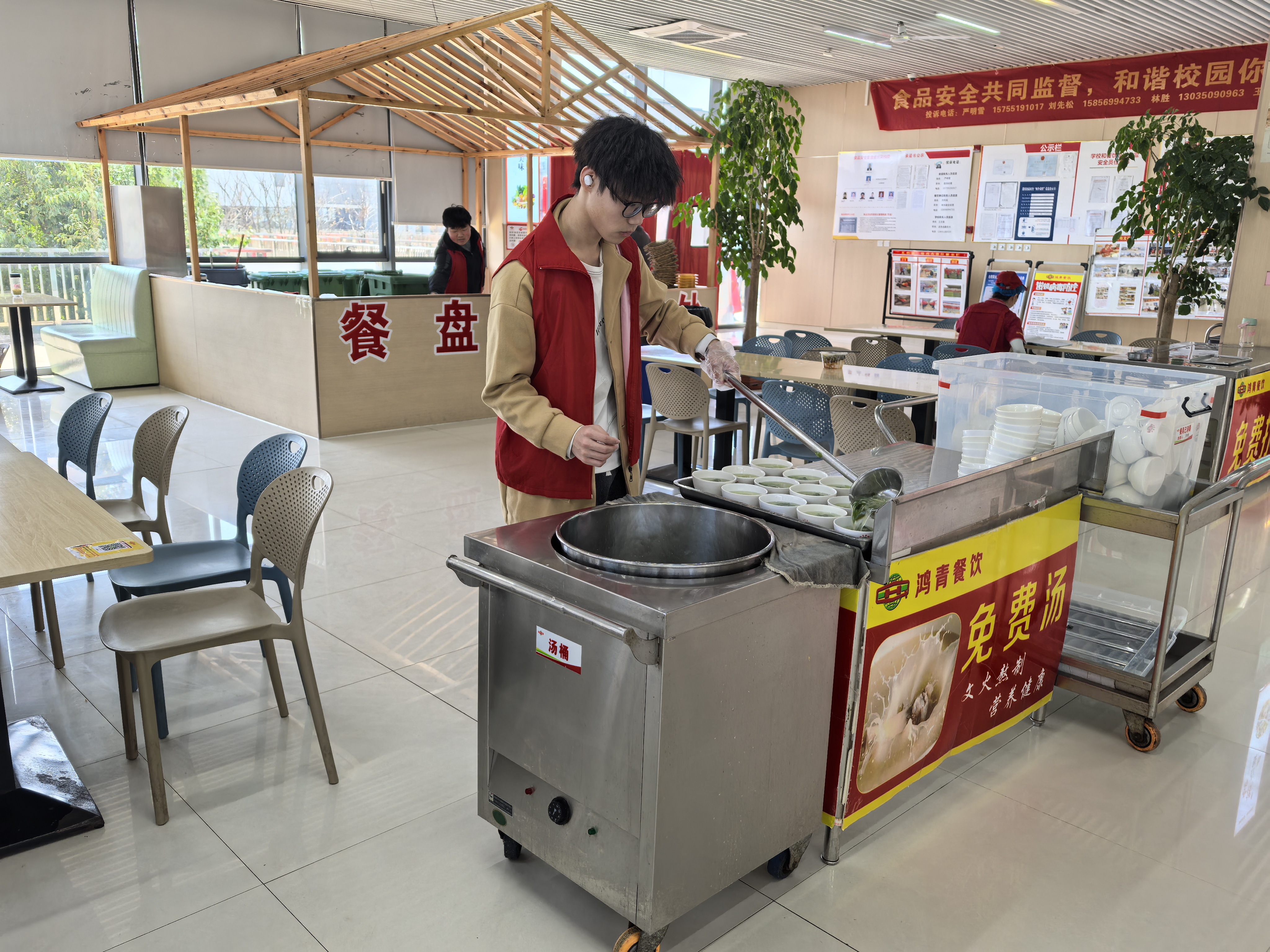 活动开始,WilliamHill中文官方网站团总支对志愿者进行了分组培训与任务分工,明确各小组职责,分为“食堂服务组”“车辆整理组”“生活帮扶组”三支队伍,分头行动。食堂服务组的志愿者们在食堂一、二楼忙碌有序。他们协助工作人员清理餐桌、擦拭地面,针对餐后残留食物和餐具及时回收整理,确保就餐环境干净卫生。此外,他们在免费汤品区为同学们提供暖心服务。