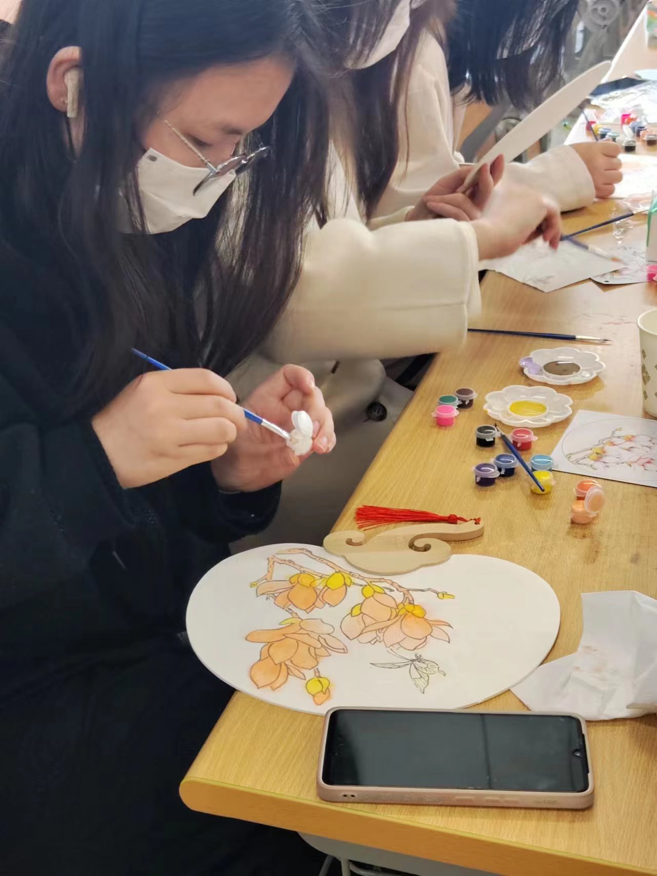 活动开始,负责人简单讲述了绘画团扇时调色和上色需要注意的事项。在了解大致流程后,待志愿者分发了团扇、颜料及调色盘等绘画工具后,同学们个个专心致志,着手绘画自己手中的团扇,空白的扇面逐渐被一笔笔颜料覆盖,图案慢慢清晰了起来。不多时,一把把精美的团扇相继完成,经过颜色填充的团扇充满古色风韵,让同学们爱不释手,兴高采烈地拿起团扇合影留念。活动结束后,同学们说:“这种清明寄托相思的方式既表达了追思,同时又绿色环保。此次活动既慎终追远、纪念先贤,也歌咏光明、赞美春天,传递了大家对伟大祖国的美好祝愿。”