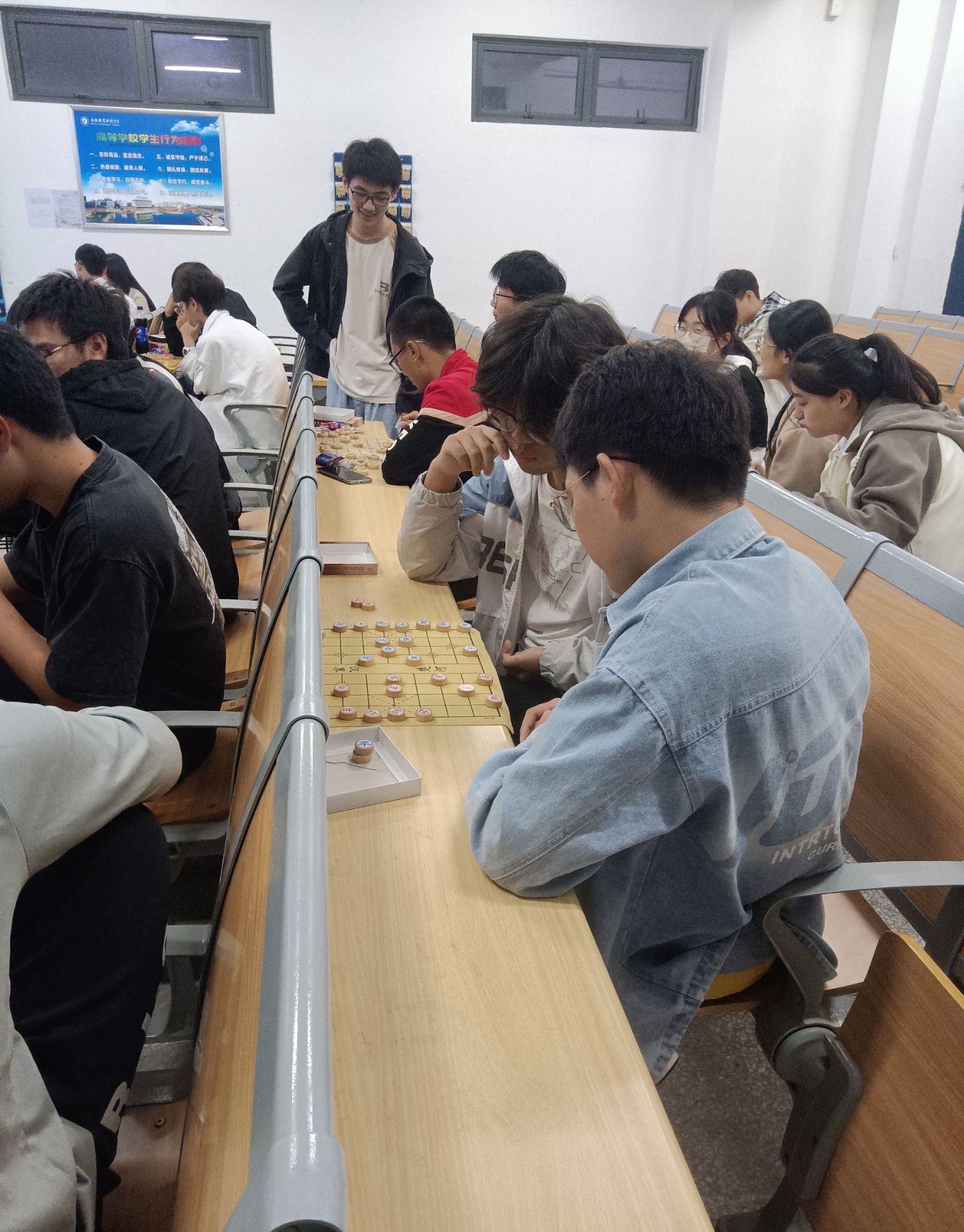 本次比赛分为小组赛和决赛两个阶段,实行选手淘汰制,共有四个小组,32名选手报名参加。赛场上,同学们你来我往,用手中的棋子,上演了一场无声的角逐,下到入迷时,甚至让人忘记了时间的流逝。经过一系列“厮杀”,二名选手进入决赛。决赛中,棋手们认真思考,谨慎行棋,或调兵遣将或跃马扬鞭。他们淡定自若,冷静地观察着棋盘,谨慎地走着每一步棋,虽然表面平静,棋盘上已经上演着激烈的“楚汉争霸”。整场比赛,赛出了风格,赛出了品质,赛出了水平。