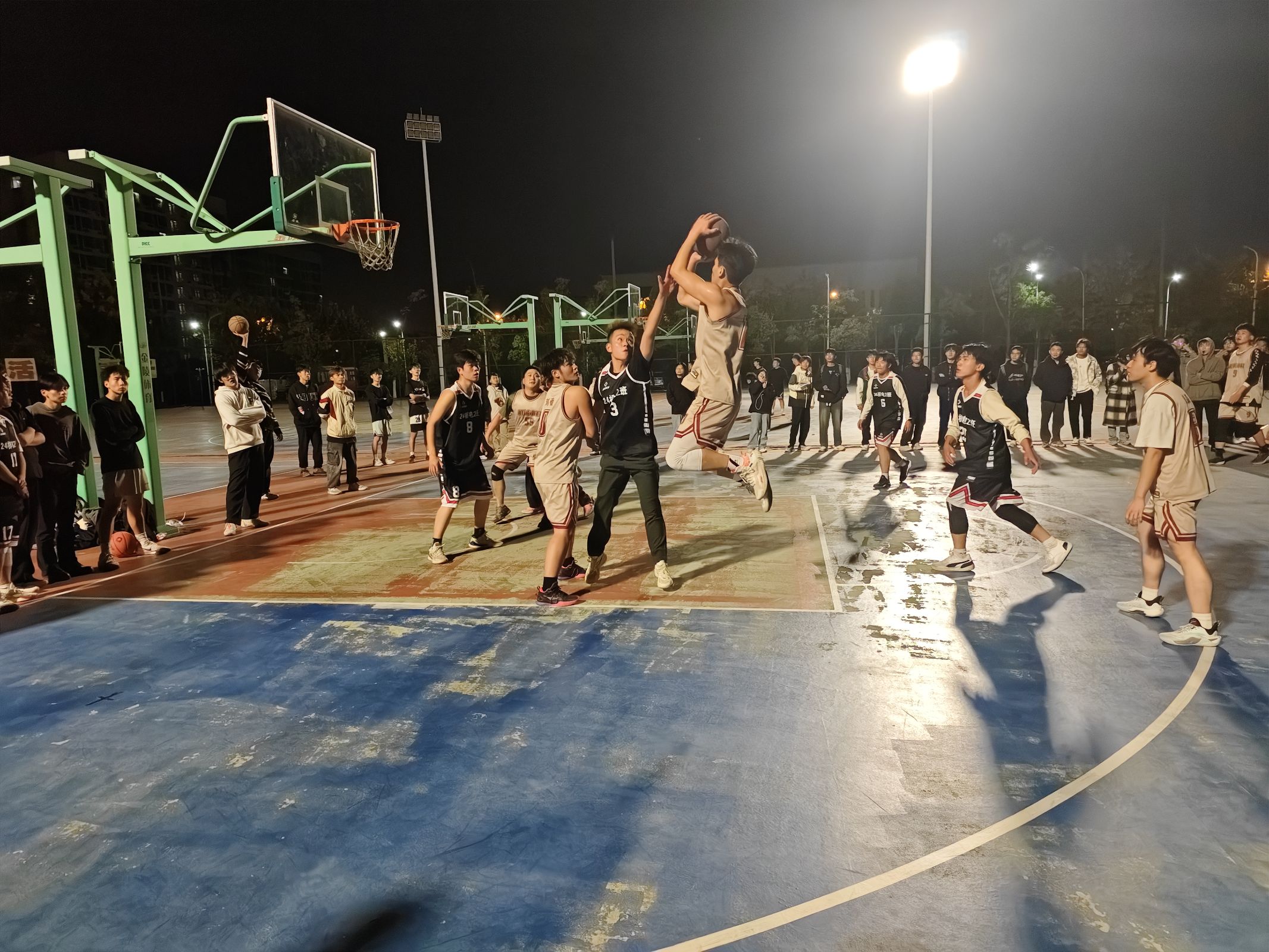 经过小组赛、淘汰赛的激烈比拼,24机械本科班、24机电2班进入了冠军争夺赛。球场上,两队球员轮番上演干拔跳投与后仰投篮的精彩好戏,比分板上双方紧咬不放,分秒间差距微乎其微。24机械本科班的队员们凭借着出色的身体素质和默契的团队配合,频繁发起进攻,试图突破24机电2班的防线。而24机电2班的防守队员们也毫不示弱,他们紧紧守住自己的阵地,积极拼抢篮板球,一次次成功地将对方的进攻化解。